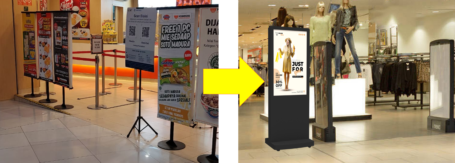 Trend media promosi saat ini mulai berubah yang sebelumnya banyak menggunakan tradisional media promosi display menggunakan 1). X Banner, 2). Roll Up, 3). Tripod, dll