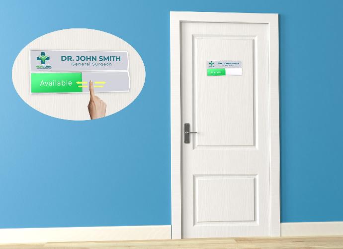 Papan Nama ruang yang bisa di geser bagian bawahnya untuk melihat dokternya sedang ada di tempat atau tidak. Tersedia 2 pilihan 1 baris dan 2 baris.