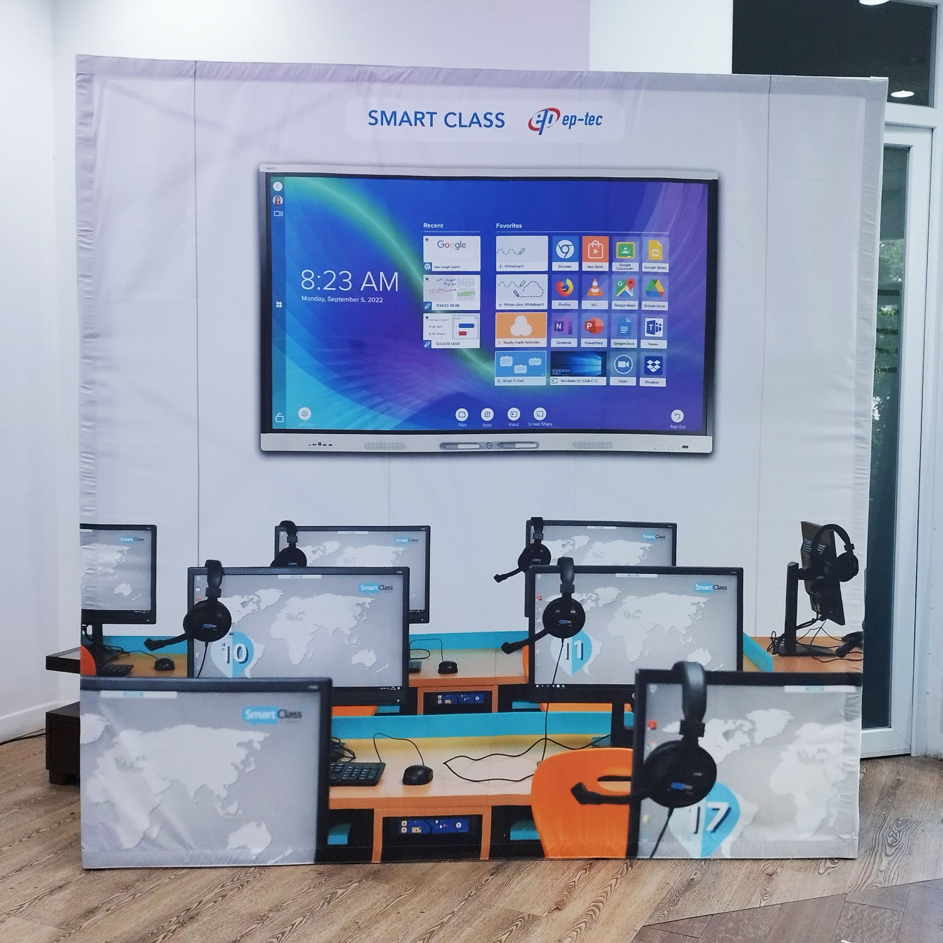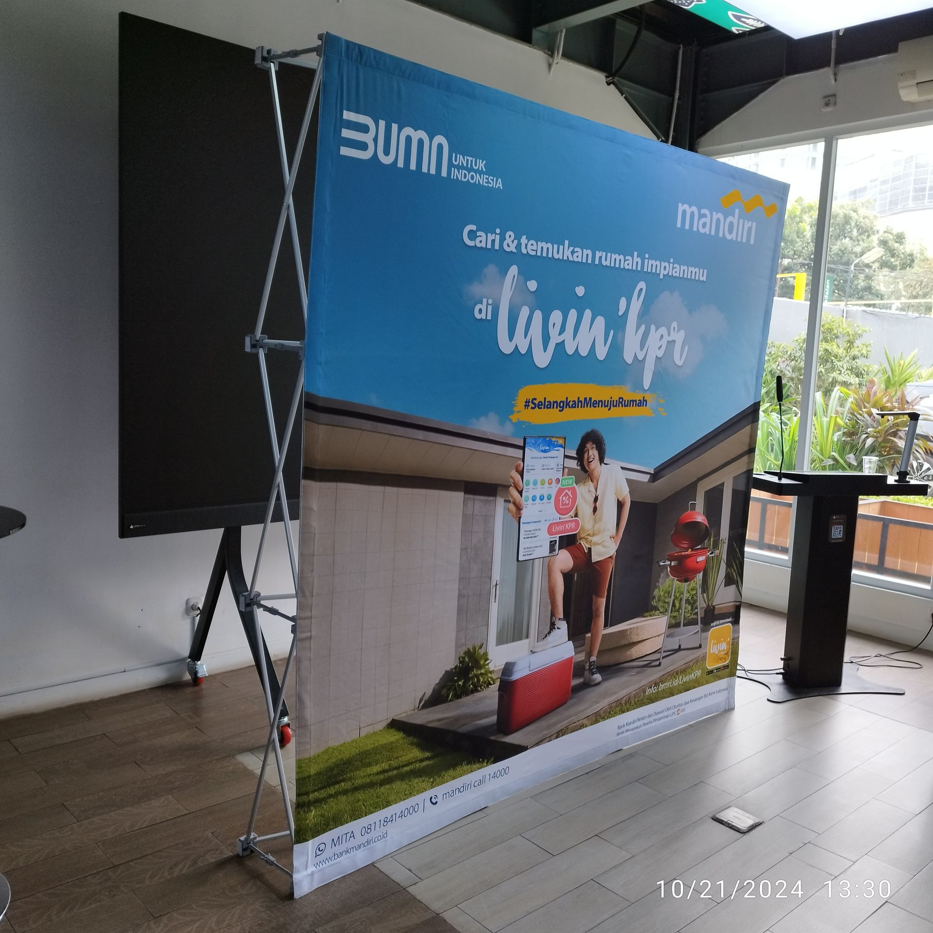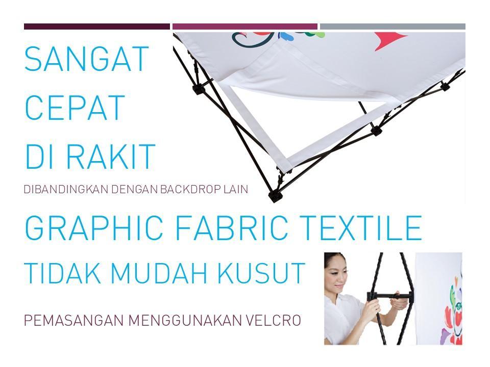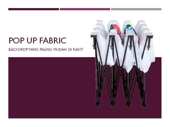 Pop Up Fabric Display merupakan perangkat portable display backwall dengan system collapsible untuk menampilkan graphic dalam ukuran besar (225 x 225 cm) yang di cetak pada media fabric textile sehingga graphic dapat ditampilkan secara penuh, rapi, dan tidak terpotong. Pop Up Fabric terbuat dari alumunium sehingga kokoh dan tak gampang jatuh selain itu Pop Up Fabric menggunakan sistem collapsible maka dapat dipasang dan dipindahkan dengan mudah tanpa perlu alat berat.