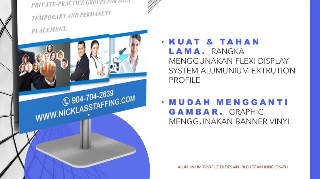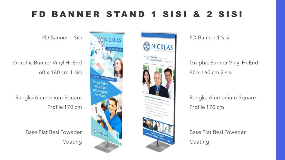 FD Banner Stand ini memiliki fitur serupa dengan X-Banner dan Roll Up. Akan tetapi mempunyai ciri khas tersendiri dengan menggunakan Flexi Display System Alumunium Extrution Profile (Rangka Alumunium yang Kuat, Kokoh dan Anti karat) sehingga menjadikan produk ini tahan lama