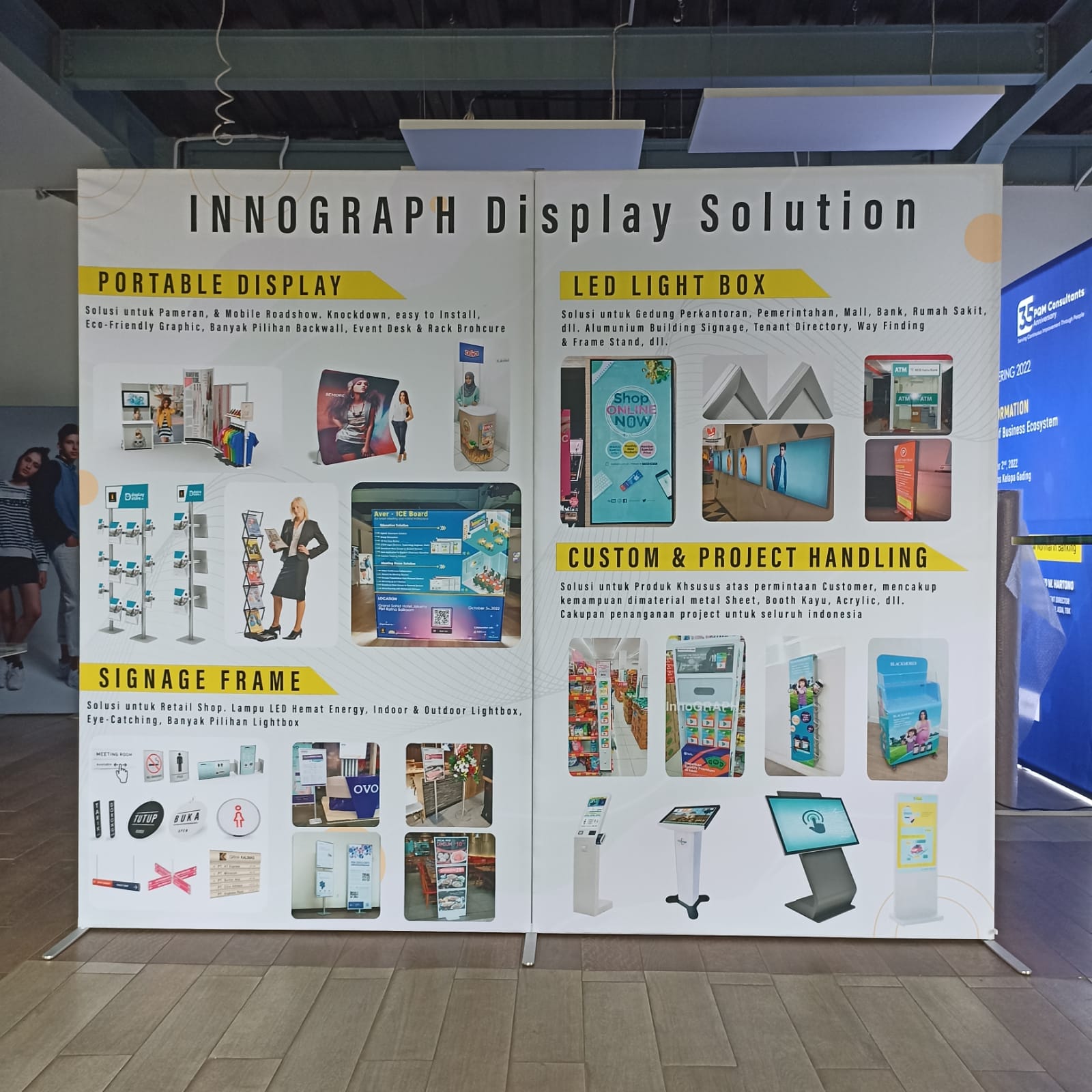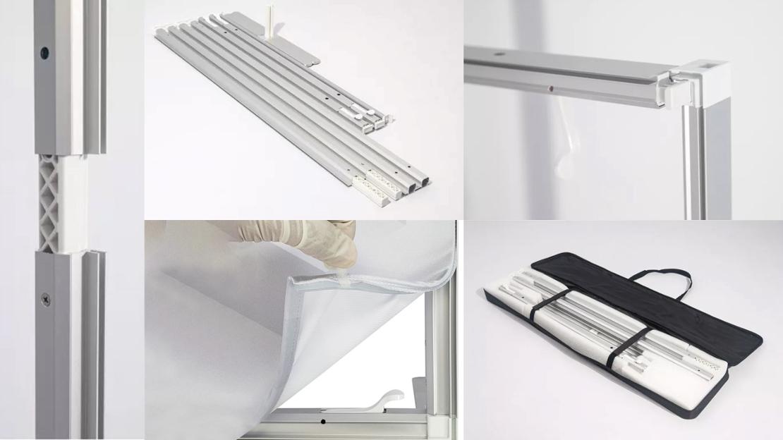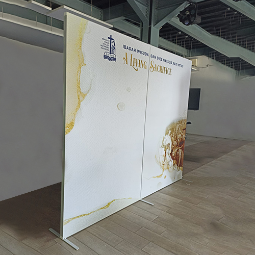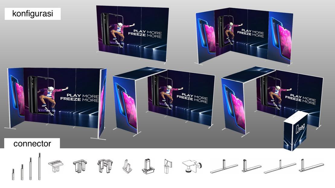 Merupakan Display System Modular untuk Pameran / Tradeshow / Roadshow yang bentuknya Modern / Slim / Rapi dengan Graphic Fabric ( Kain Textile + Silicon Edge). Rangka Alumunium Profile Ringan dan anti karat dan Knockdown tanpa butuh bantuan alat untuk pemasangan dan mudah dalam mobilisasi karena penyimpanan ringkas dalam tas