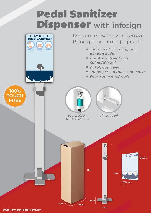Produk sanitizer dengan sistem Knock Down injakan kaki yg dapat di operasikan tanpa menyentuh apapun (sabun dan kran) dilengkapi dengan pengaturan ketinggian pada bak penampungan dan dilengkapi kapasitas air sebesar 60 liter.