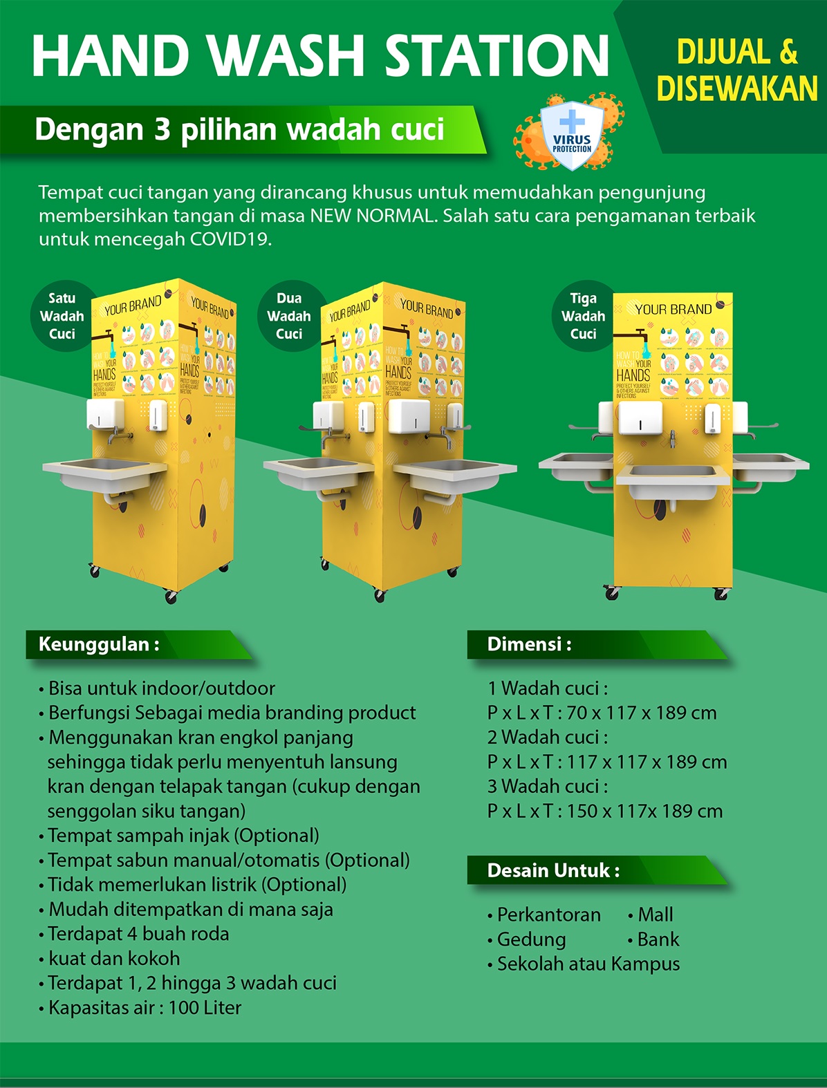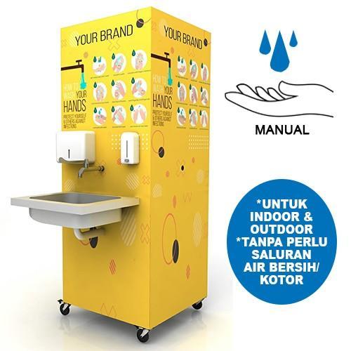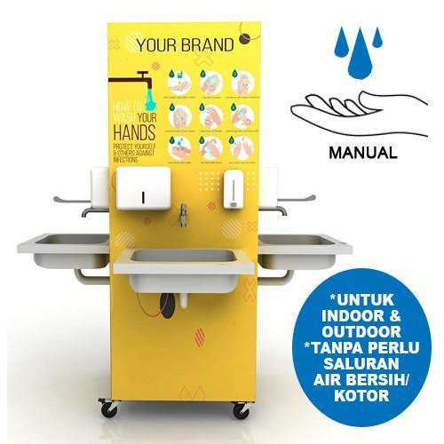 Tempat cuci tangan yang dirancang khusus untuk memudahkan pengunjung membersihkan tangan di masa NEW NORMAL. Salah satu cara pengamanan terbaik untuk mencegah COVID19.