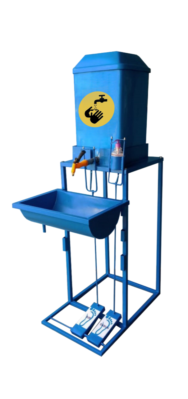 Produk sanitizer dengan sistem Knock Down injakan kaki yg dapat di operasikan tanpa menyentuh apapun ( sabun dan kran) dilengkapi dengan pengaturan ketinggian pada bak penampungan dan dilengkapi kapasitas air sebesar 60 liter.